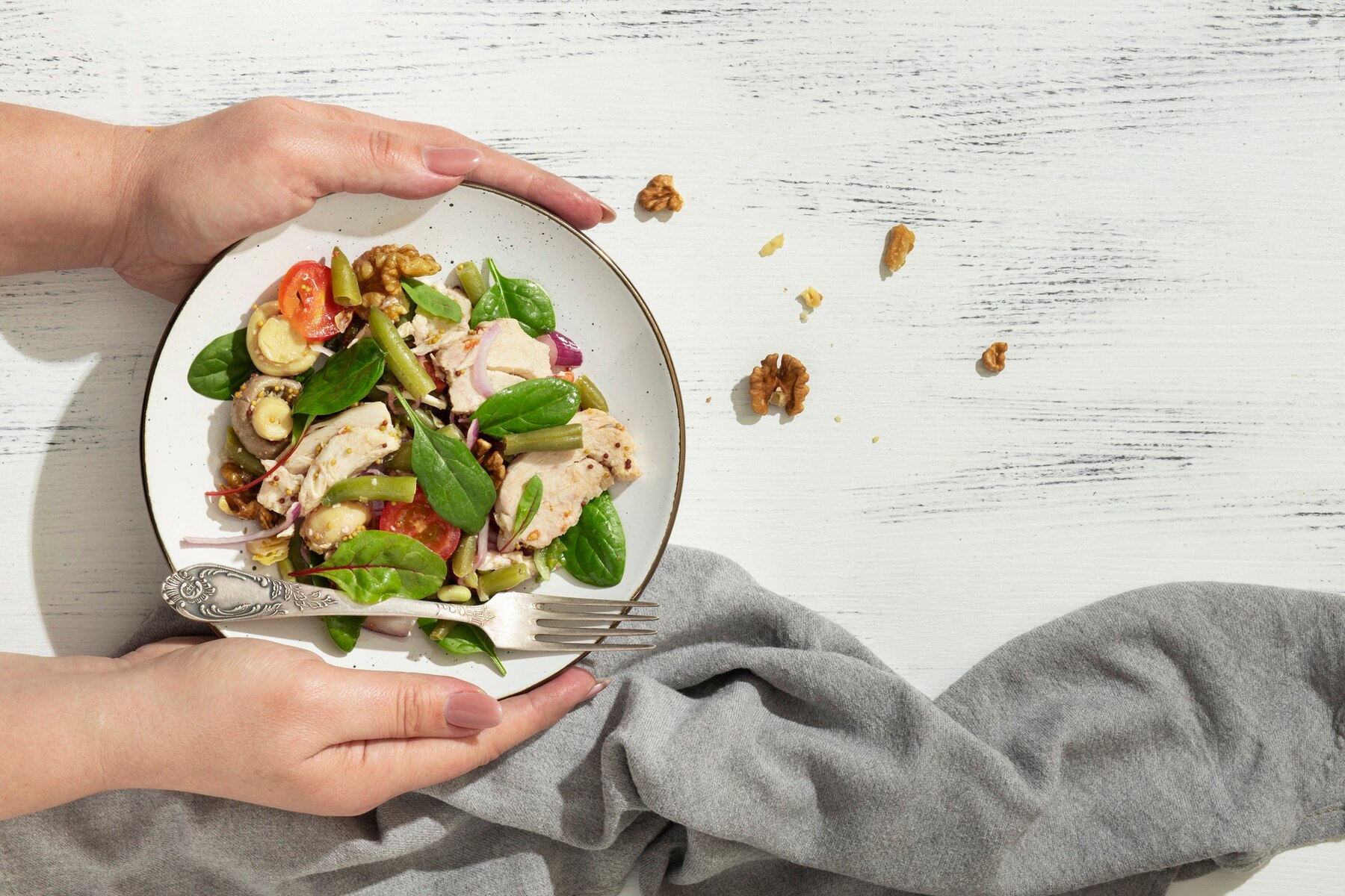 Белковые продукты (четверть тарелки): Это может быть мясо, рыба, яйца, птица, творог или растительные источники, такие как тофу или чечевица. Белок необходим для поддержания мышечной массы, регенерации клеток и работы иммунной системы.